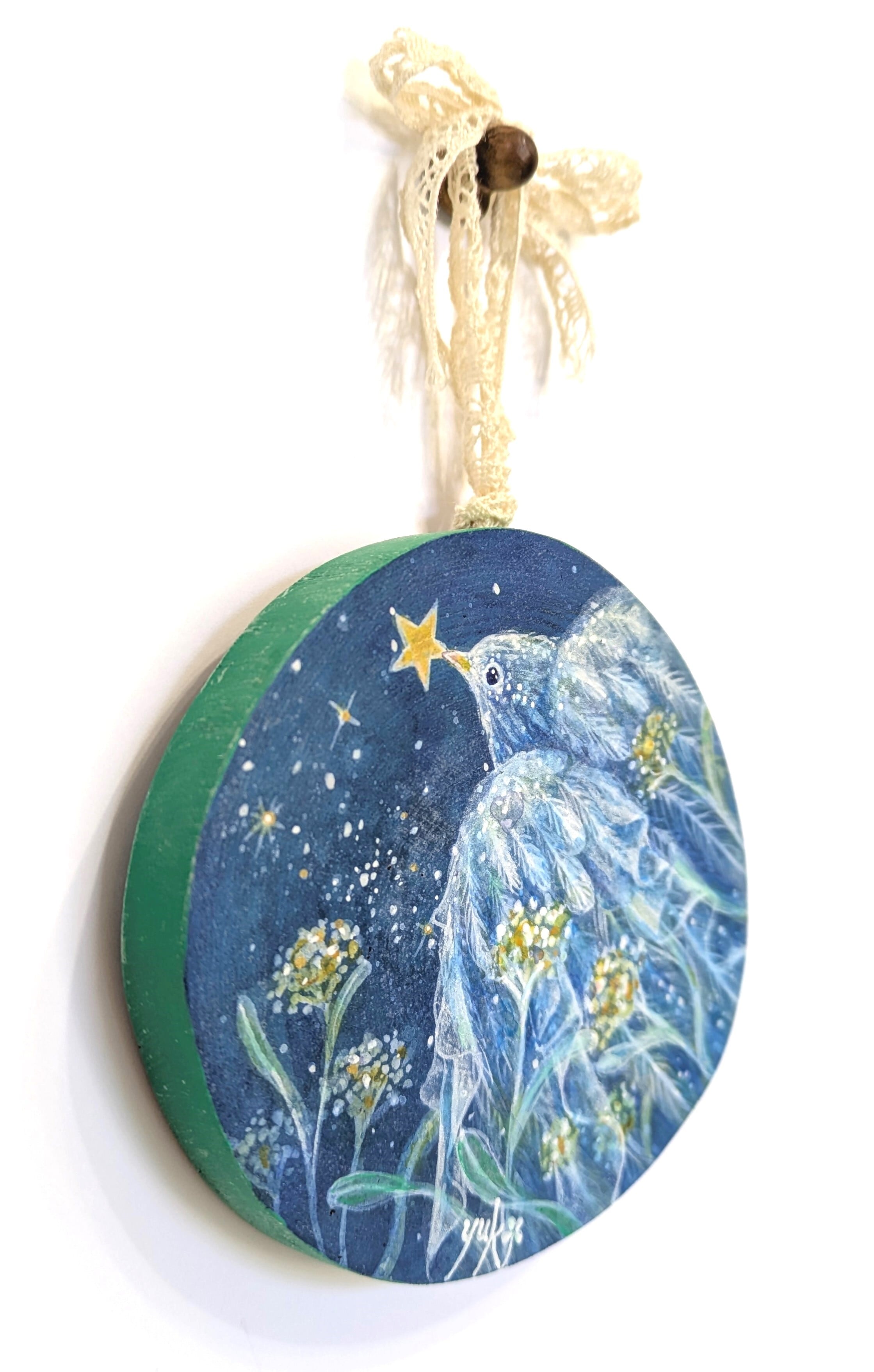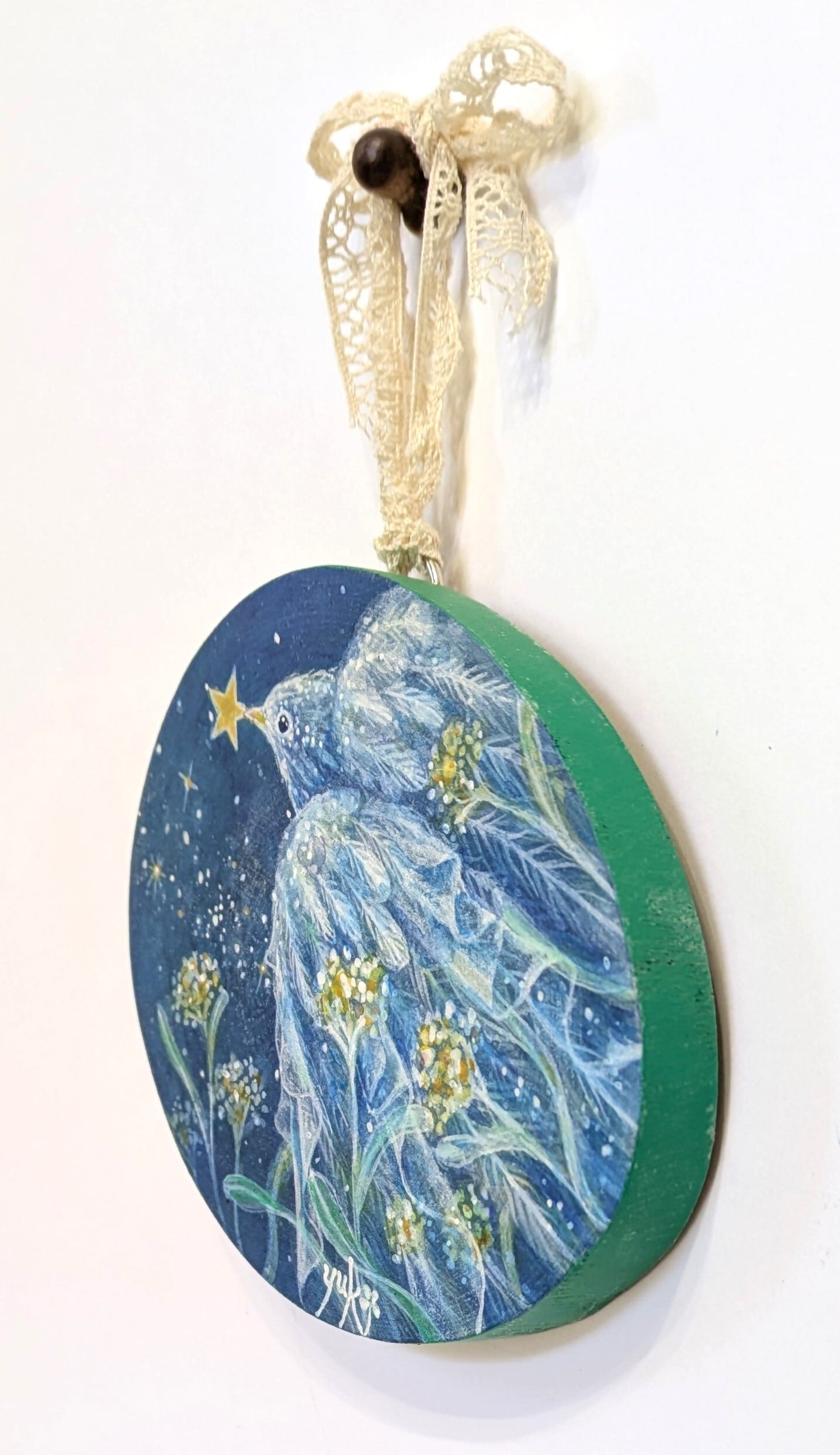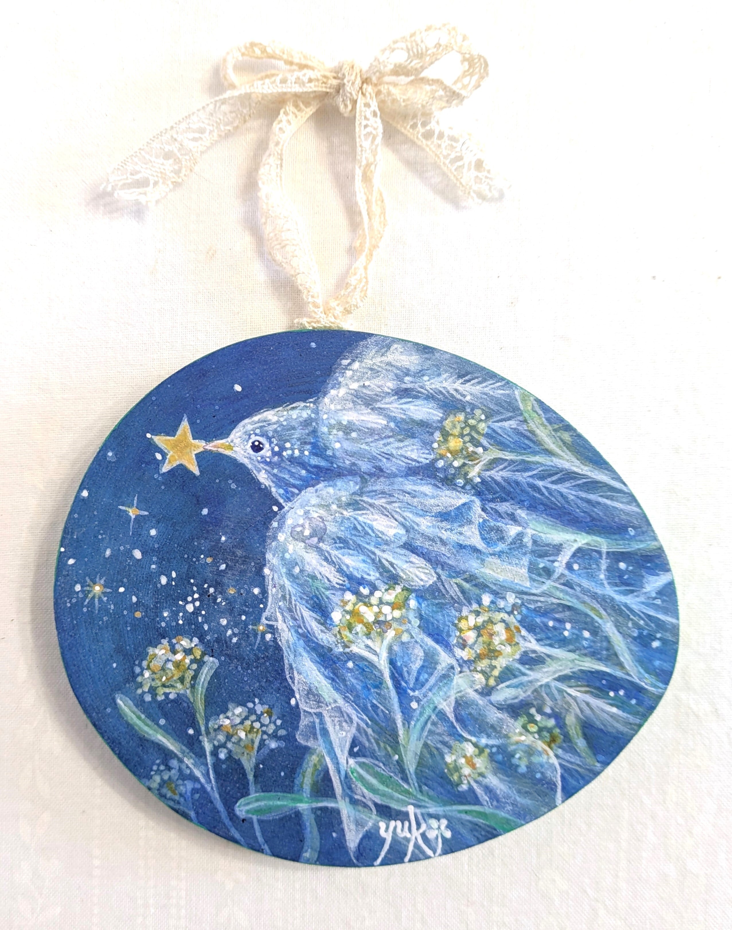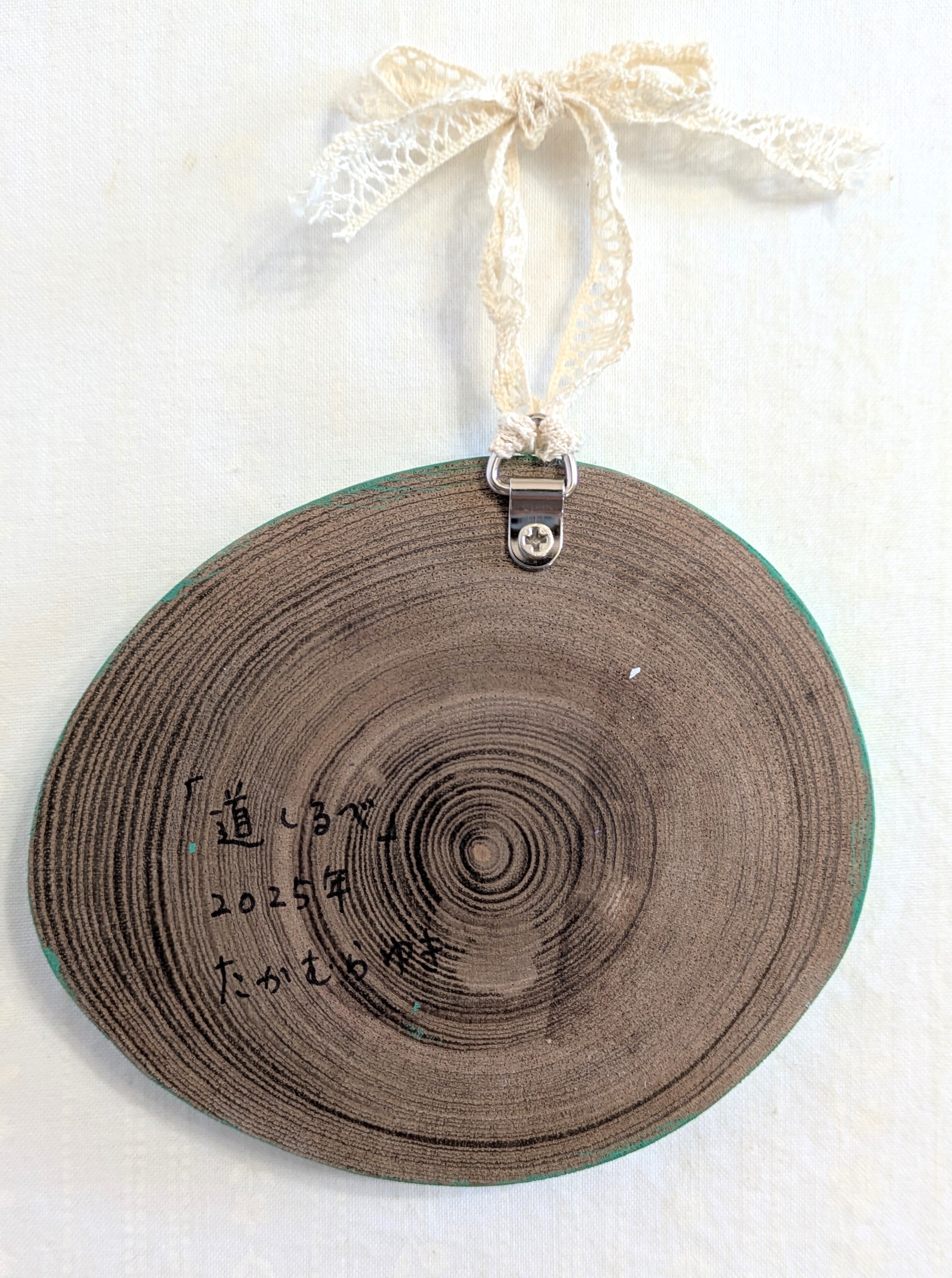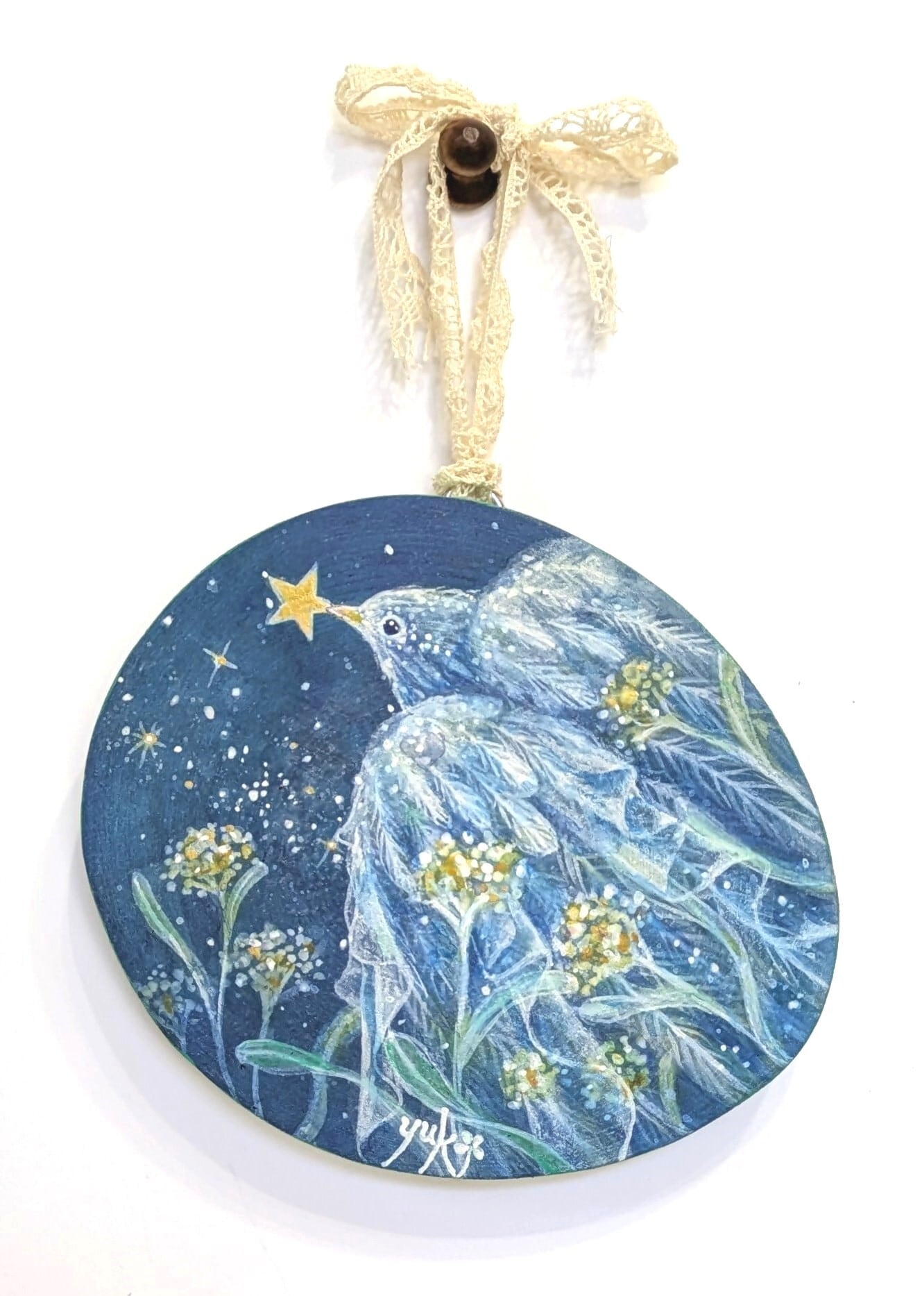 木、アクリルガッシュ、レース、コーティング材、金具
