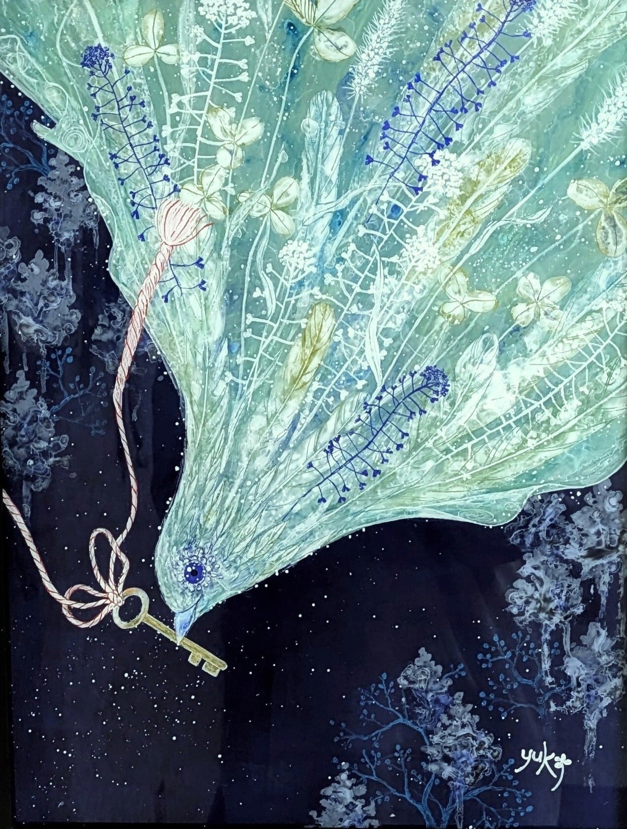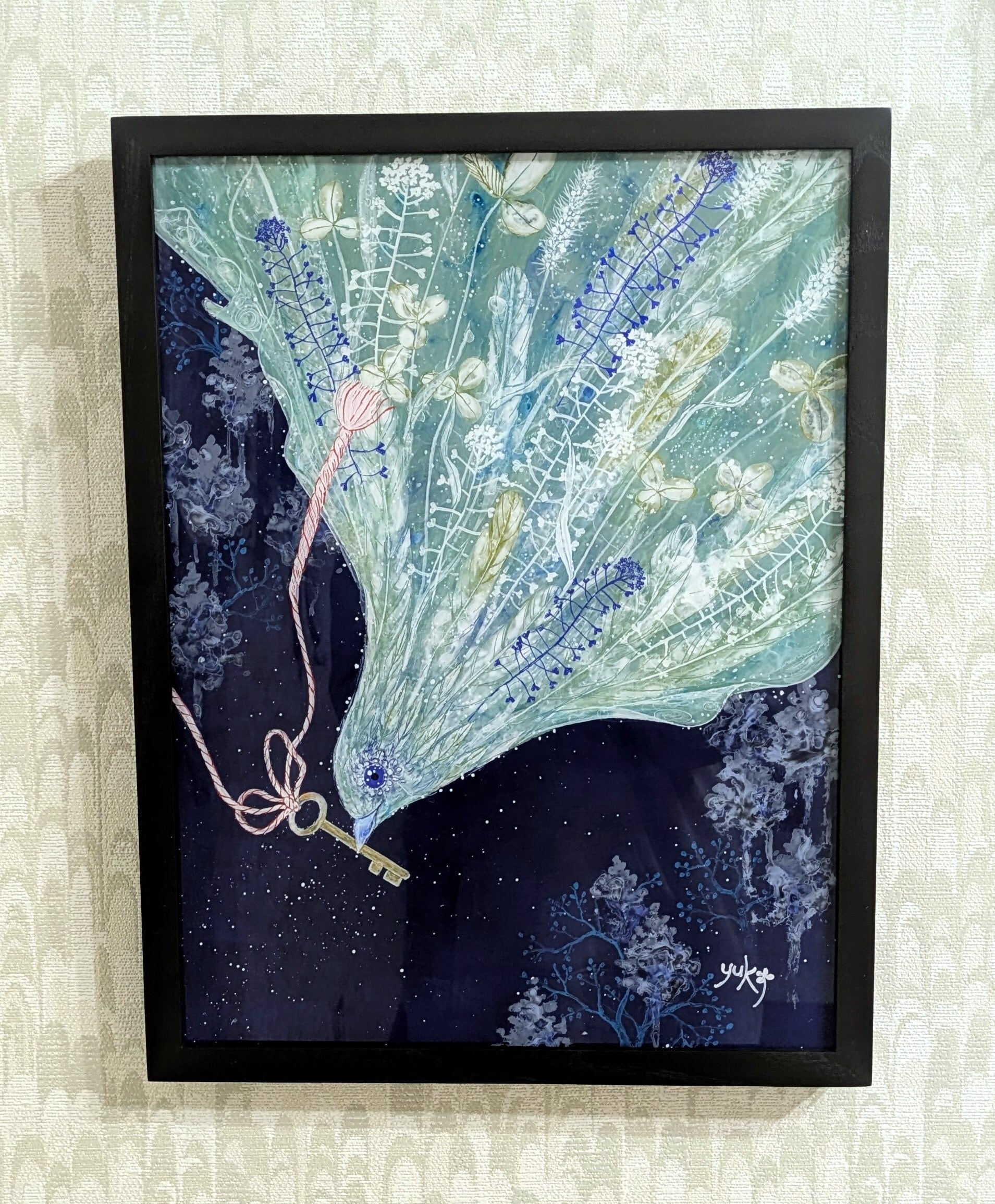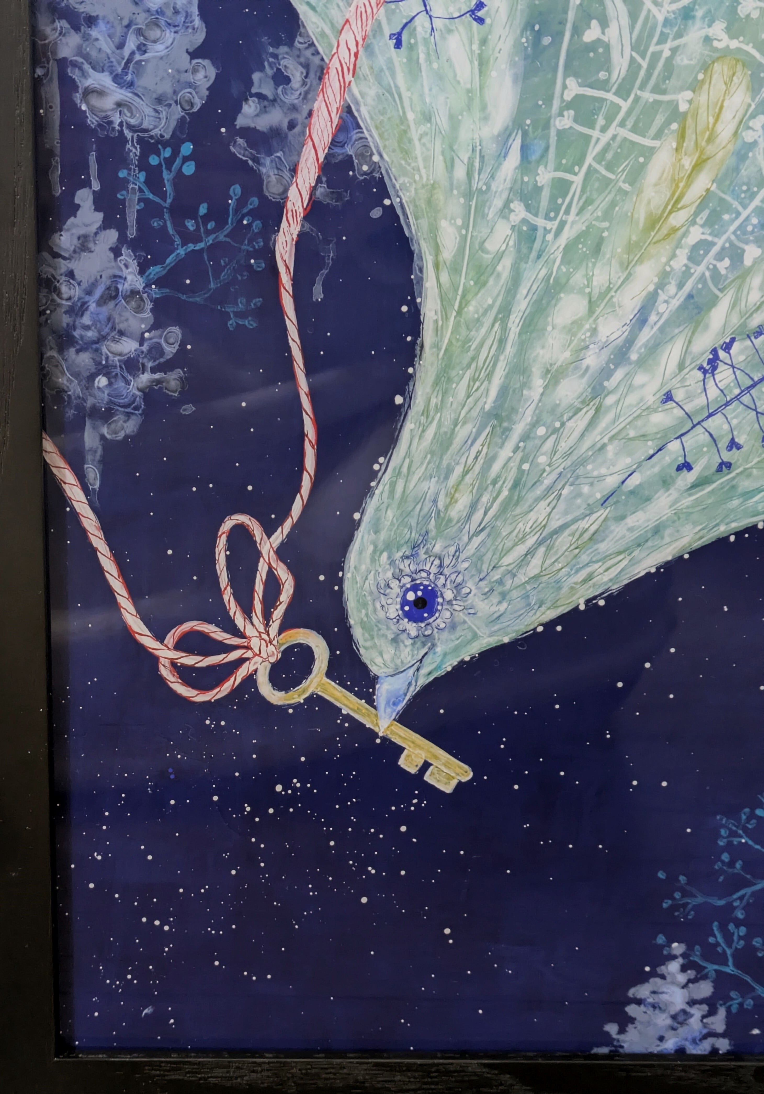 ・ガラス絵技法(ガラス絵とはガラスの裏面に描き、表に返して鑑賞するものです。仕上がりが左右逆になります。絵の具の鮮やかさがそのまま反映されるのも特徴です。この作品はアクリル板に描いています。)