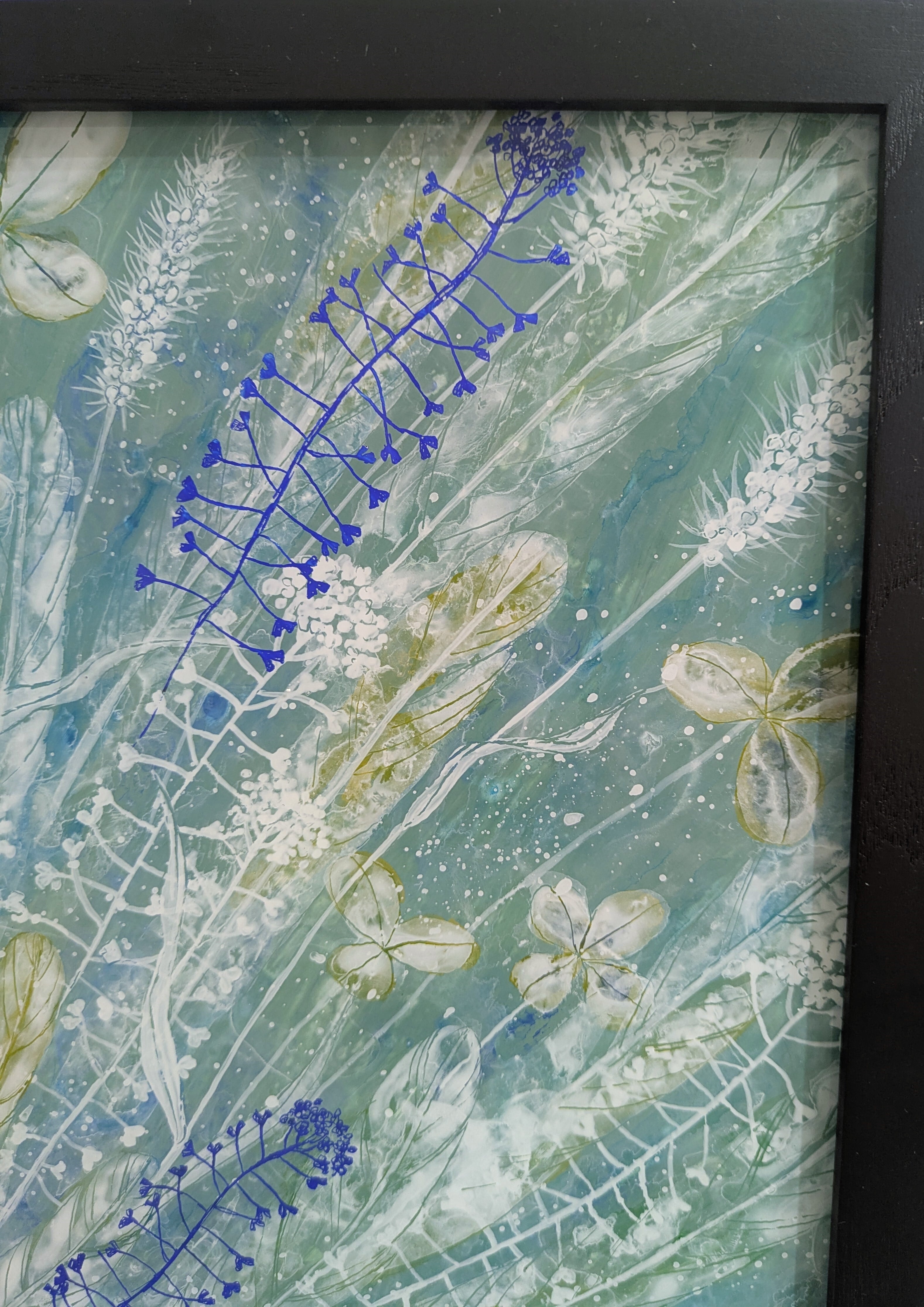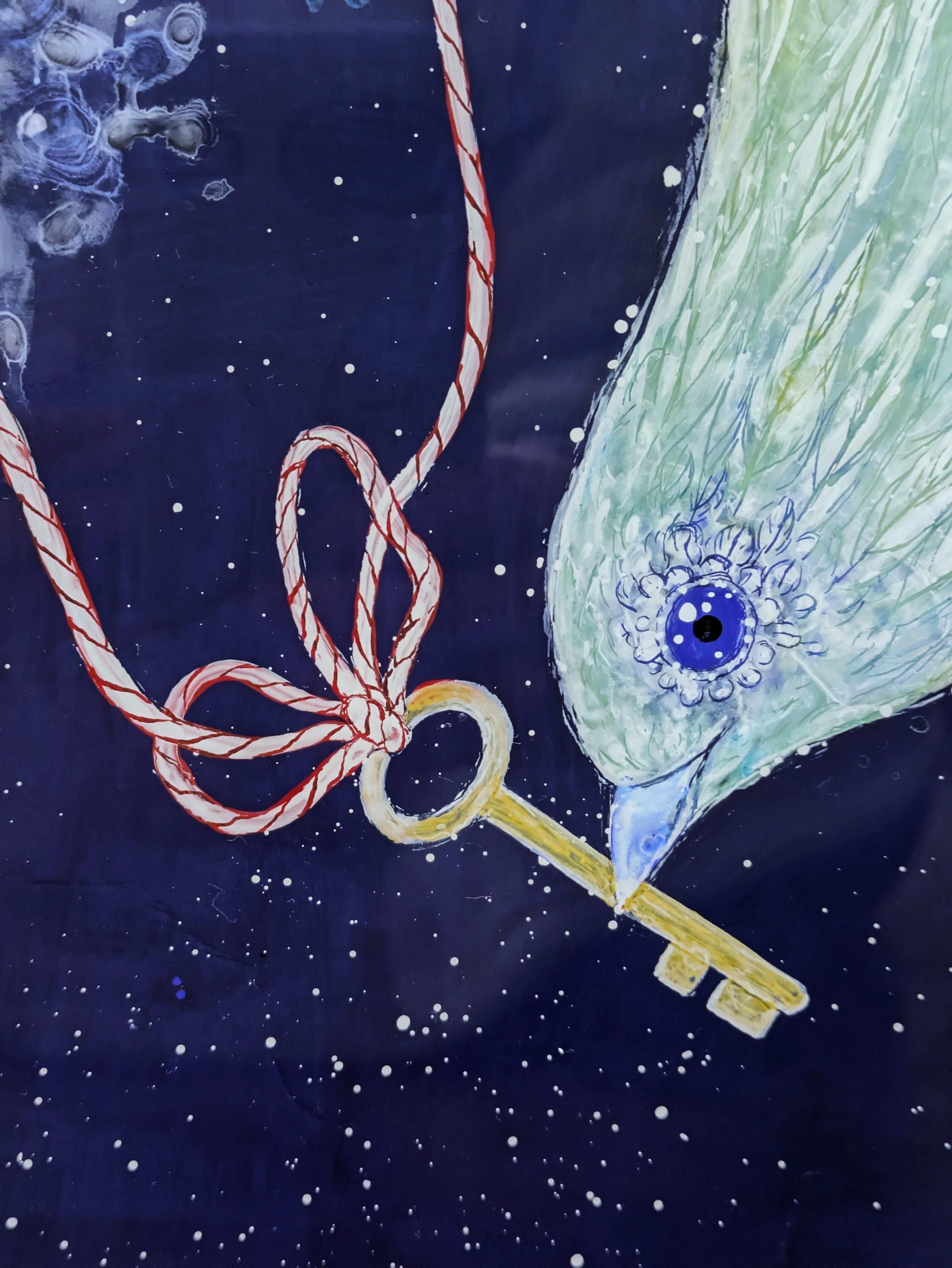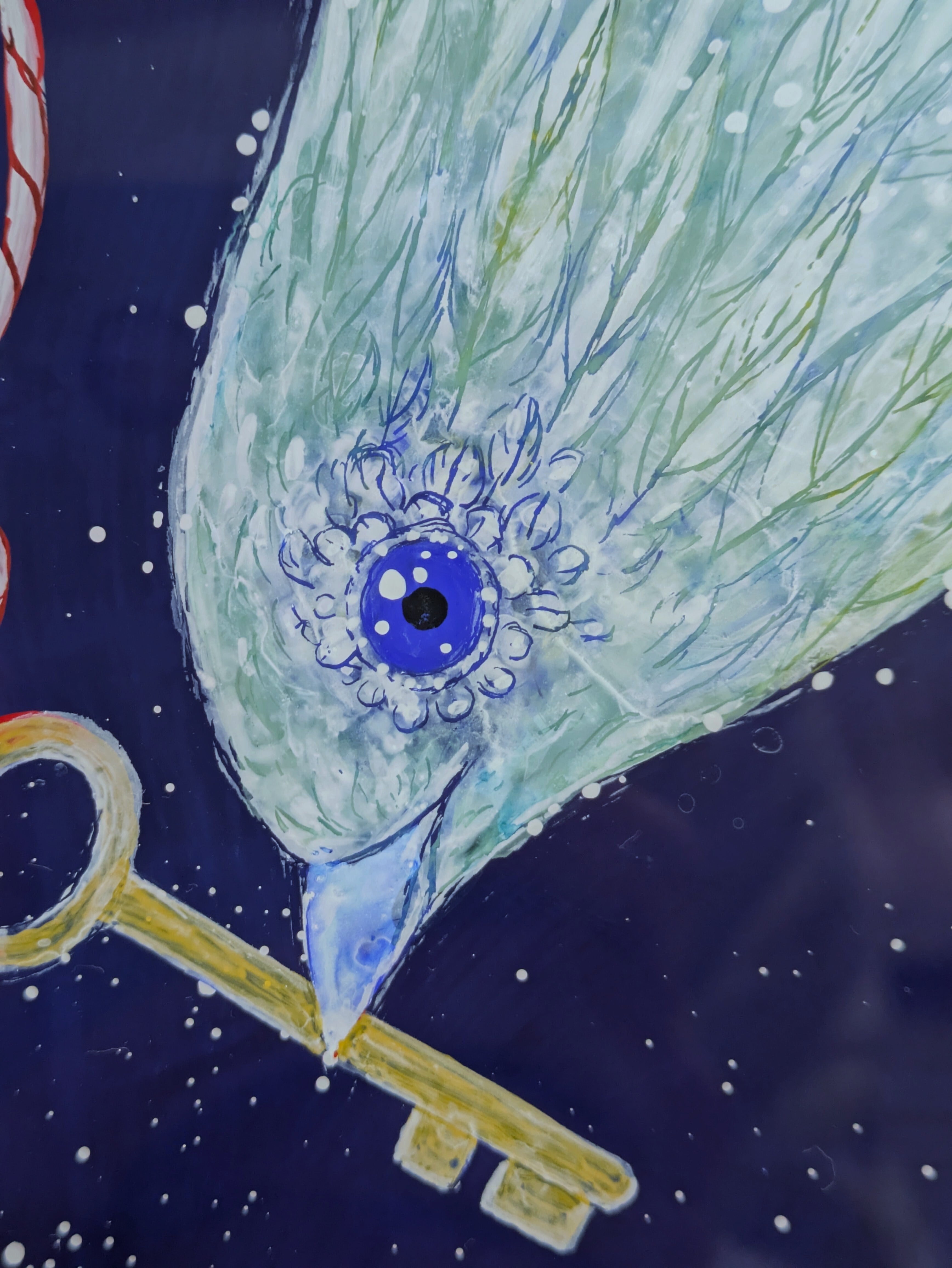 ・ガラス絵技法(ガラス絵とはガラスの裏面に描き、表に返して鑑賞するものです。仕上がりが左右逆になります。絵の具の鮮やかさがそのまま反映されるのも特徴です。この作品はアクリル板に描いています。)