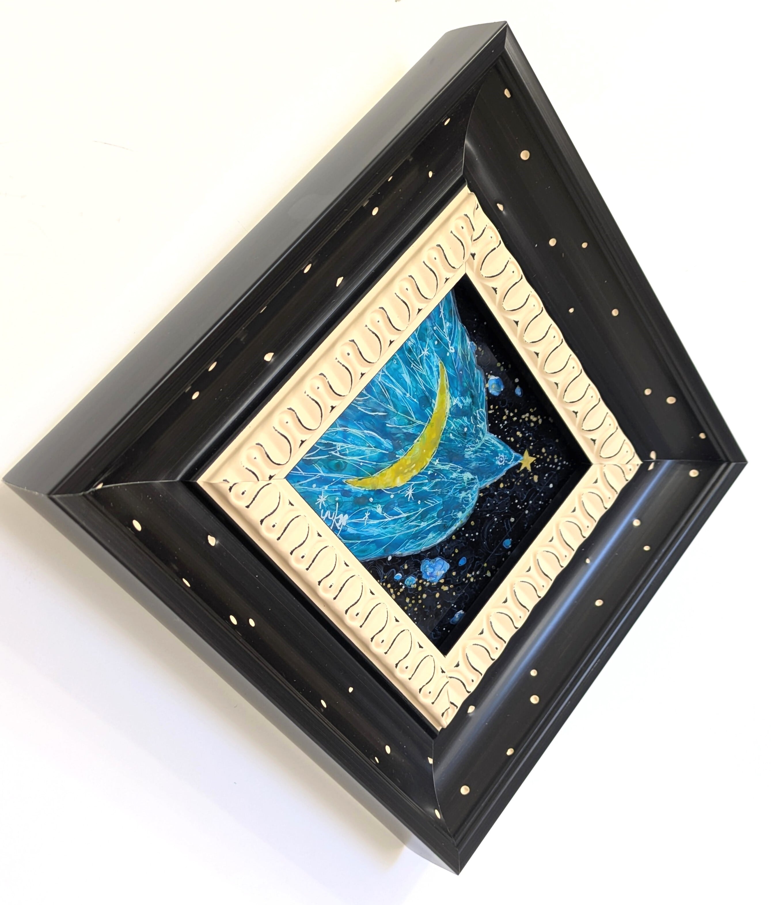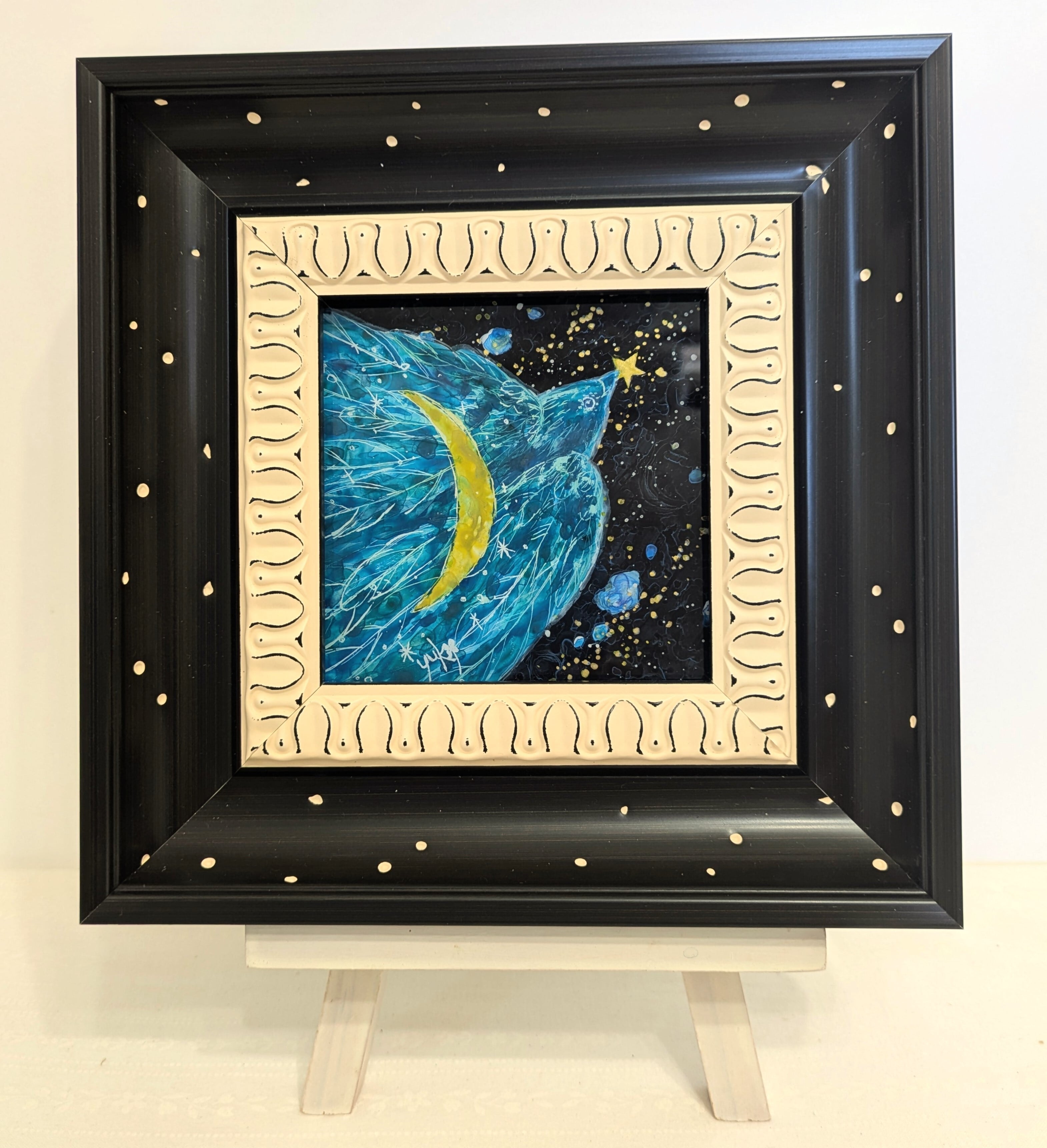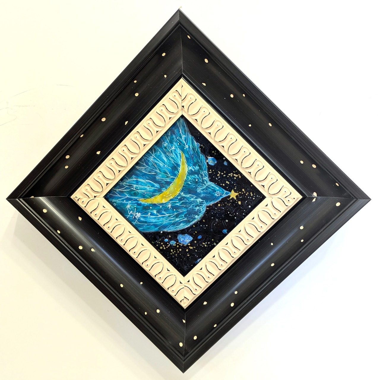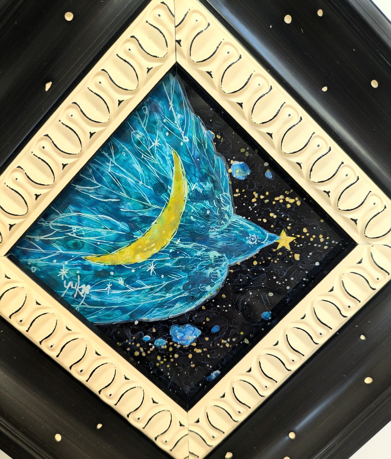 ※ガラス絵とはガラスの裏面から描き、表から鑑賞する技法です。この作品にはガラスではなくアクリル板を使用しています。